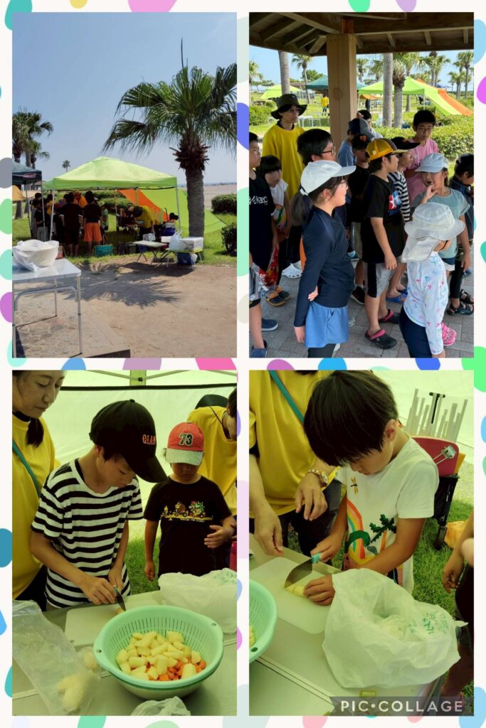 大工町と合同で青島へ行きました。空が青く、波も穏やかでした。児童の兄弟も飛び入り参加し、仲良く活動することができました。