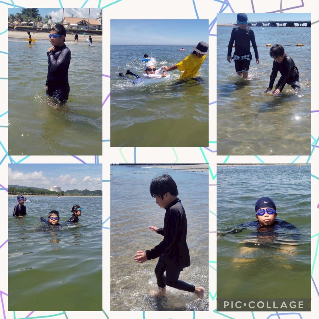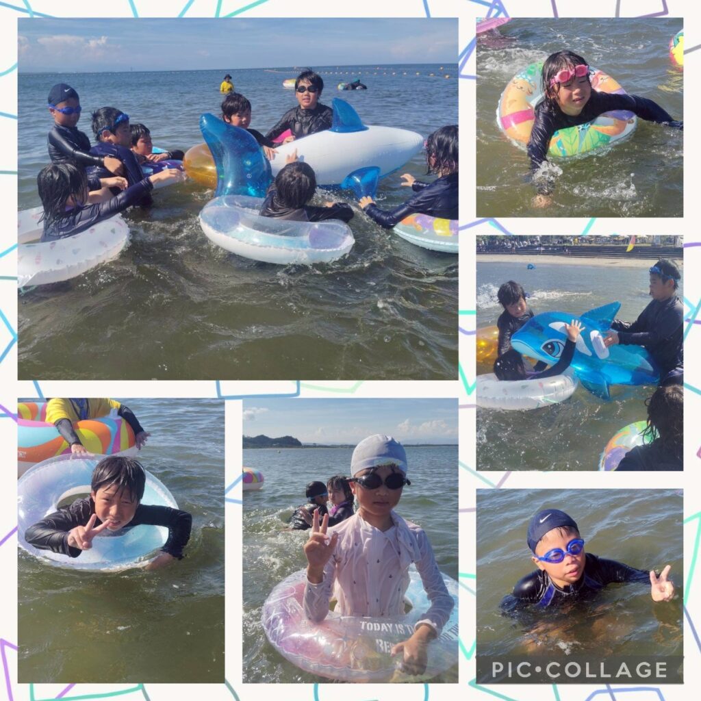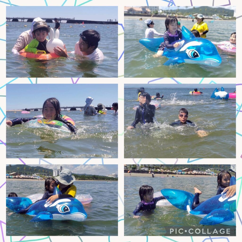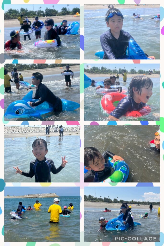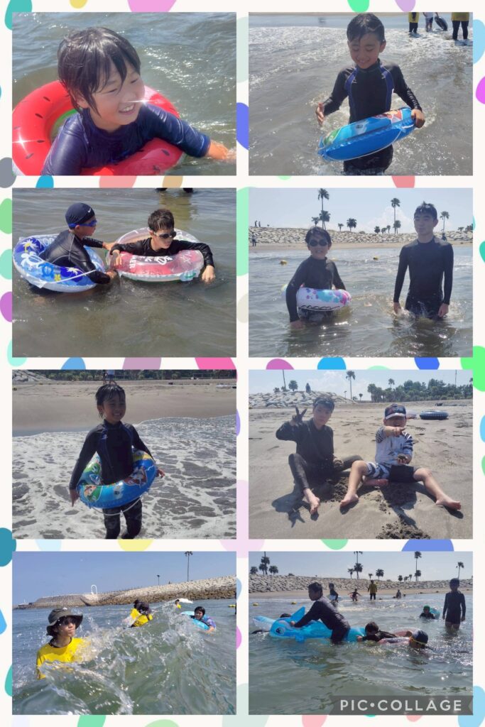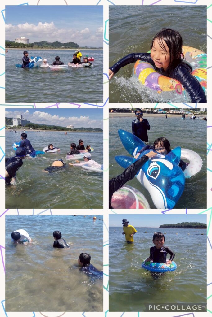 午後は遊泳ゾーンへ移動し、海水浴を楽しみました。近くを船が通ると、波がザブ〜ン🌊浮き輪で波打ち際まで上手に波乗りできました😊
