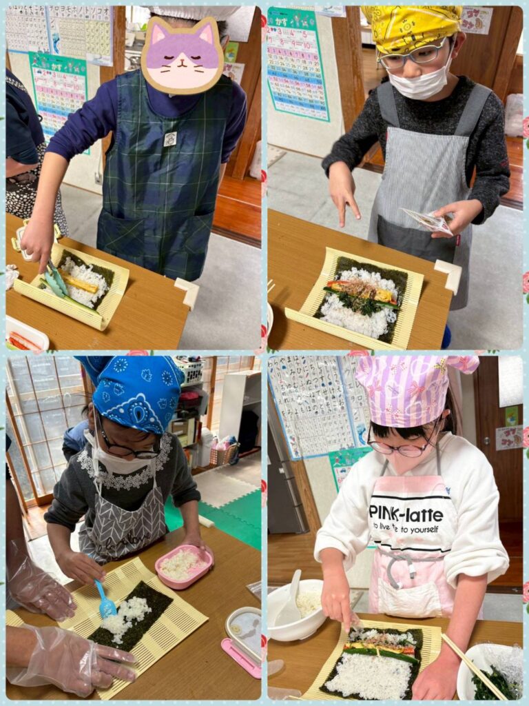 持って来たご飯を酢飯にして海苔の上に酢飯と7種類の具材を乗せたら巻き簾を使って巻いていきます。難しいけどみんな頑張りました✨️👇️