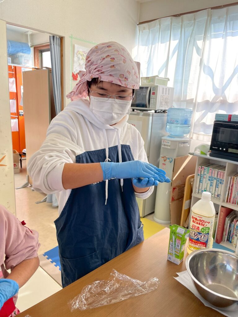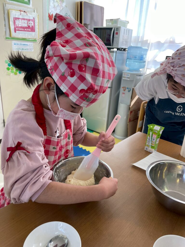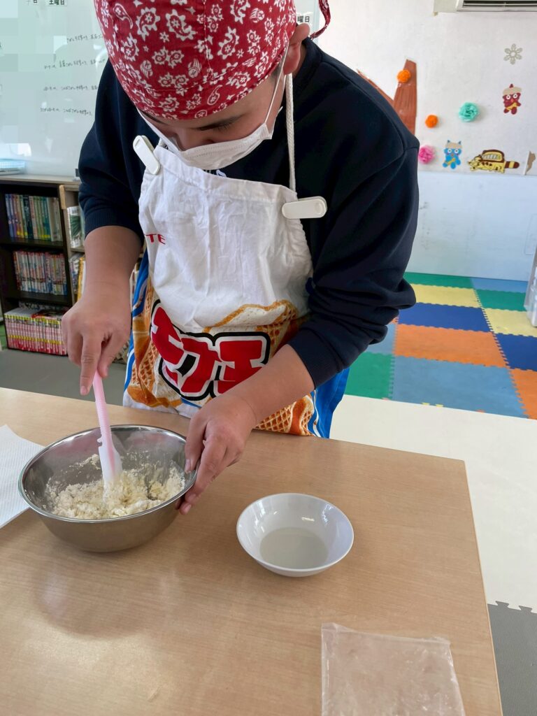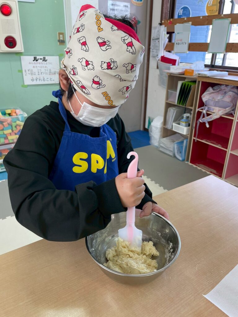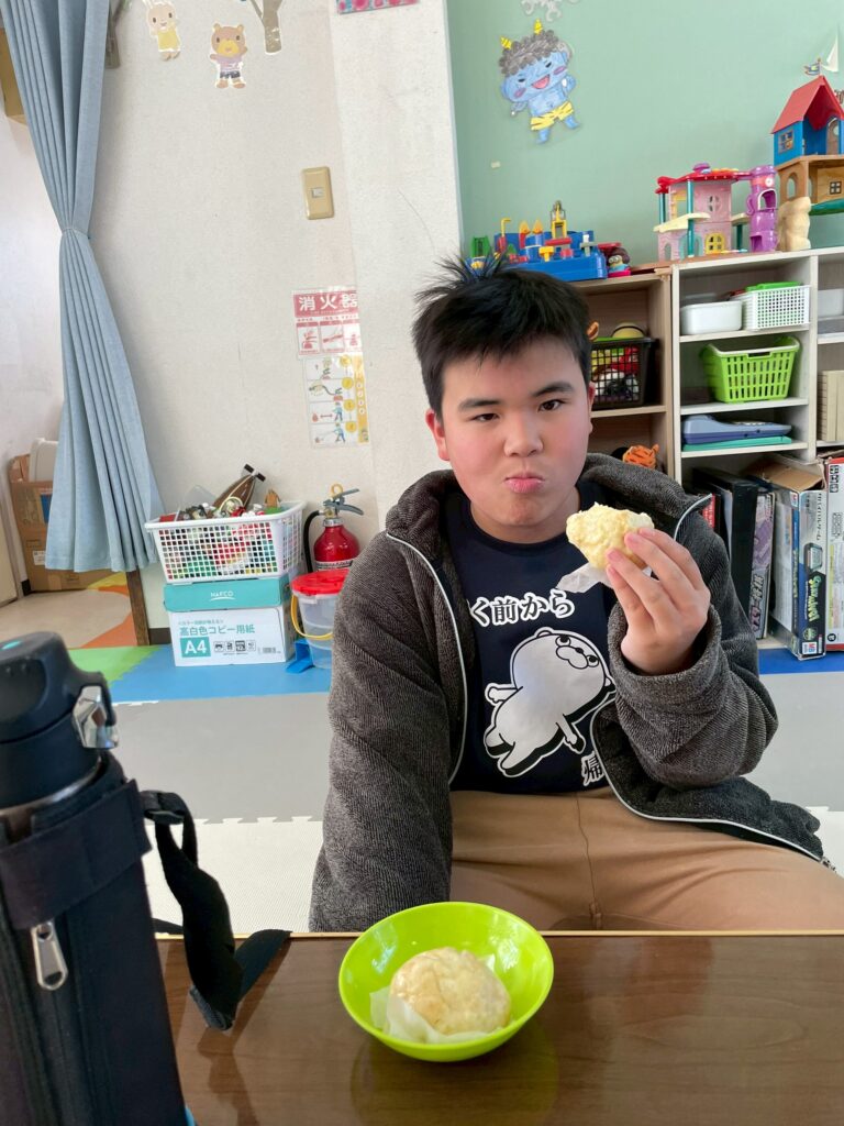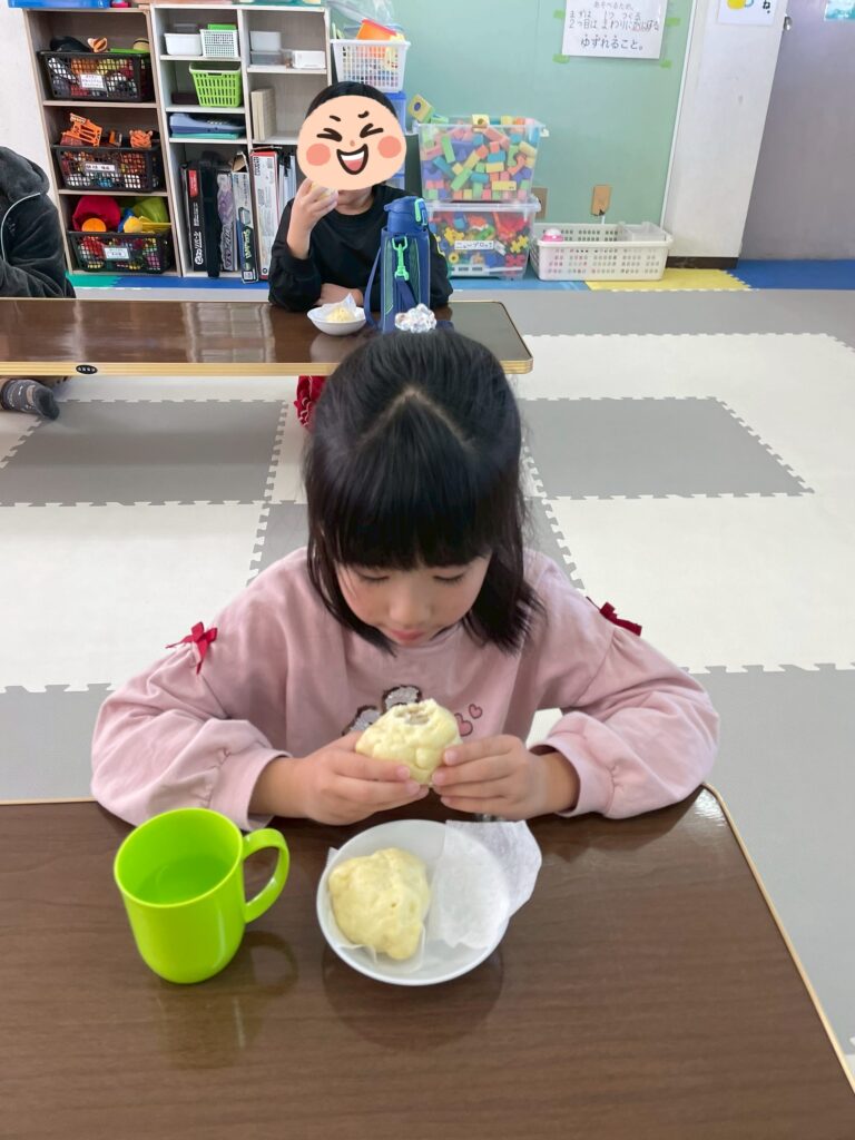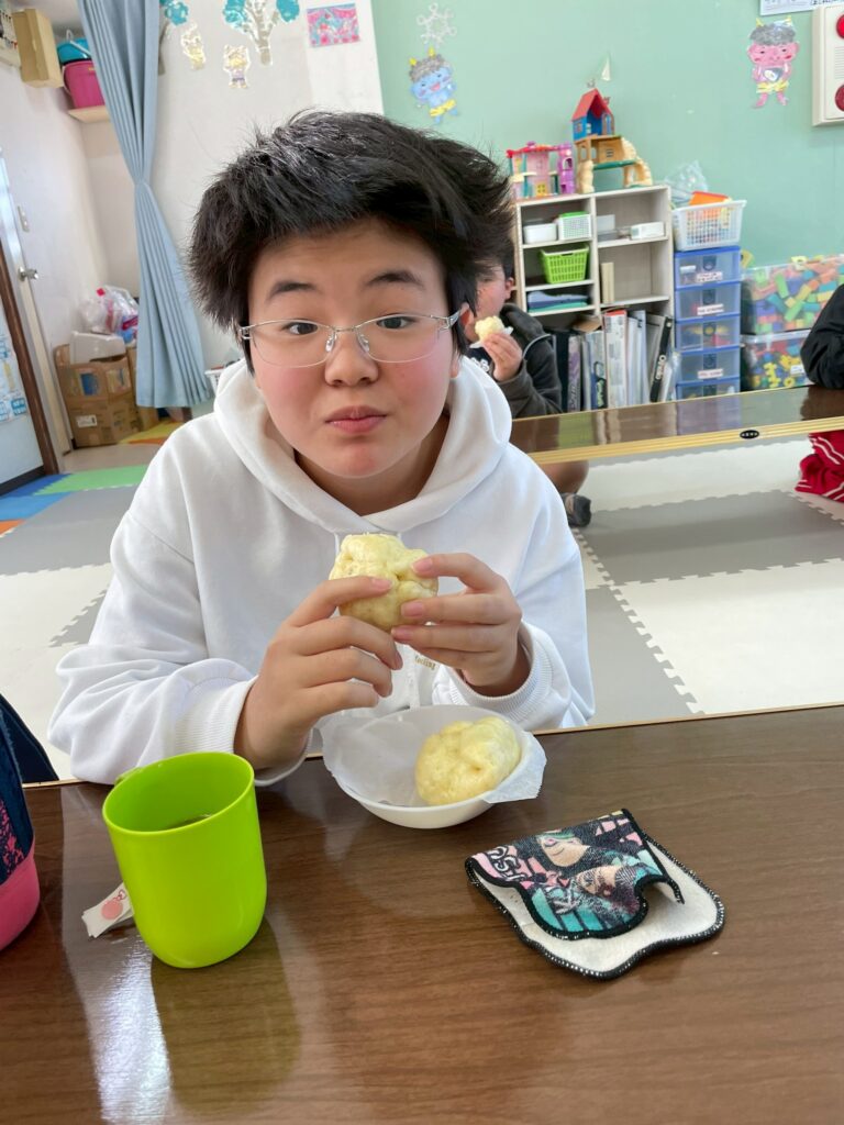 1/24(土)肉まん作りをしました。皆、2個をぺろっと食べましたよ。さて、問題です。肉まんの具材はなんでしょうか?答えは写真の最後に。