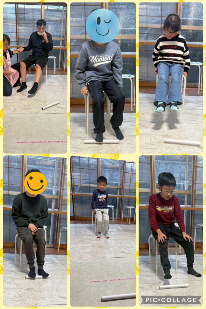 足を使っての棒転がしでゴールをめざせ!では力加減と感覚の支援を行いました!!皆んな楽しく取り組んでました。