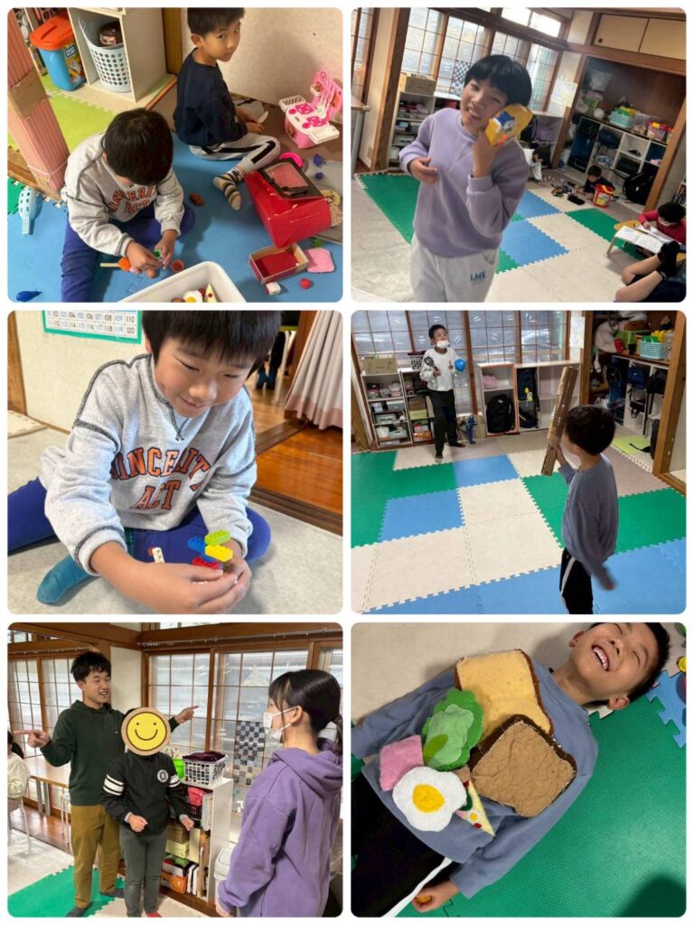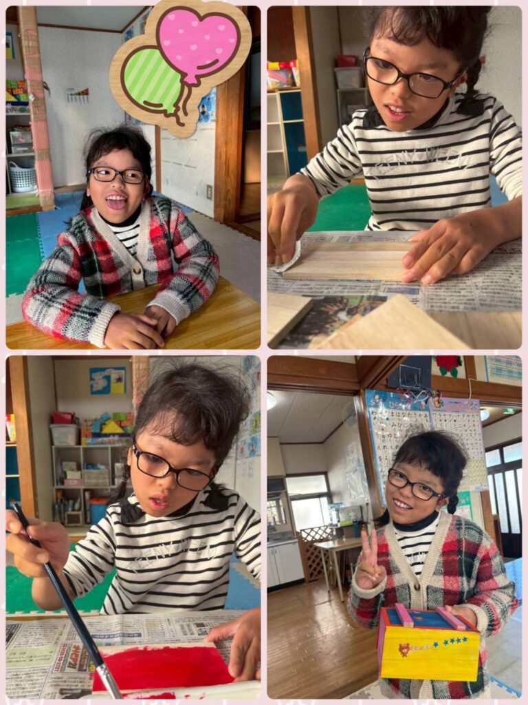 👆️振替休日の午前中。左上はあいうべ体操をしているところ😛 他の3枚は宝箱作りの様子です。世界にたった1つのステキな宝箱ができあがりました✨️