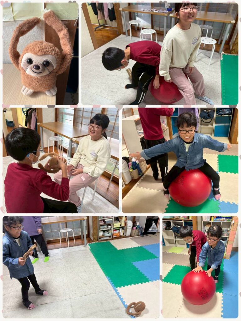 👆️自由活動の様子。最近しまのうちにやって来たナマケモノのおもちゃも人気です🦥