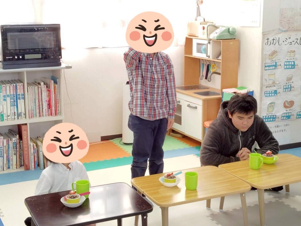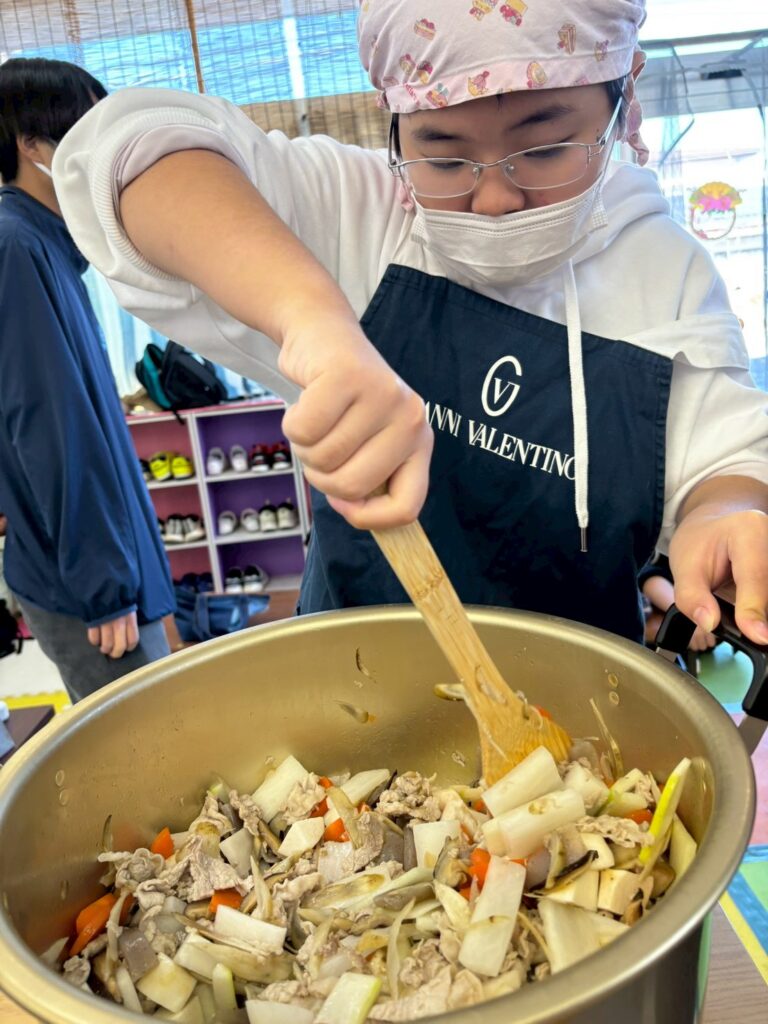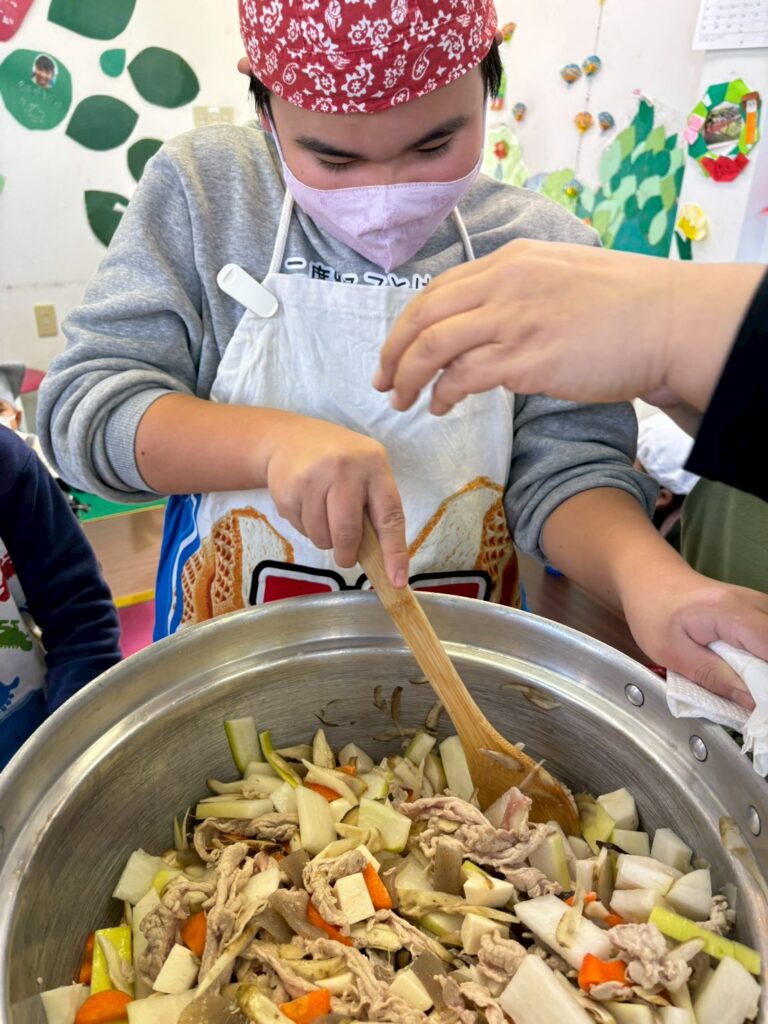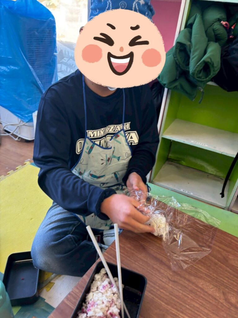 👨‍🍳12/27 つきみがおかに3事業所が集まり、おにぎりと豚汁を作ったり、一緒に遊びました。1年間の振り返りも発表しました。
