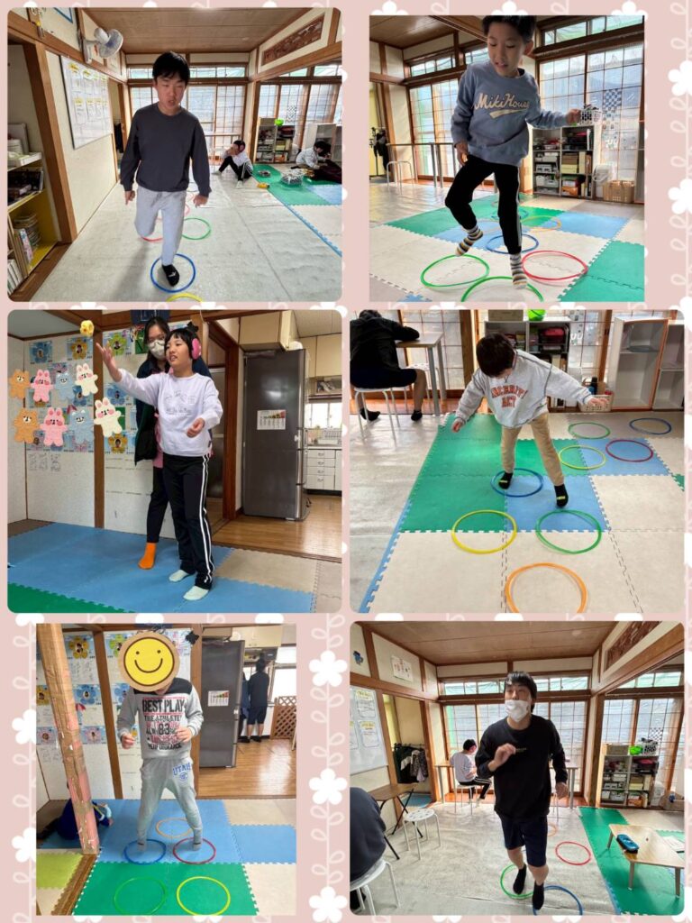 今週の運動は「輪っかジャンプ」片足跳びは足を替えてもう1回。それぞれ跳びにくい方があることに気付きます。👇️