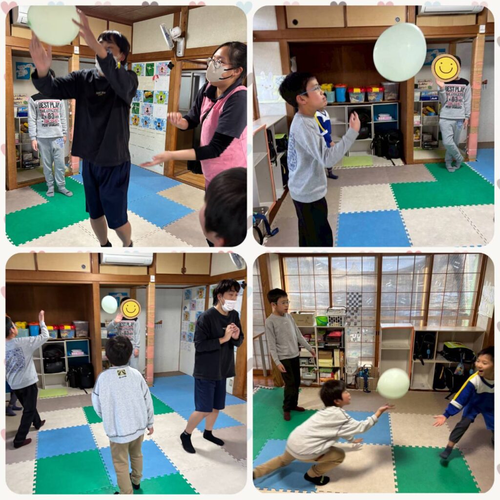 集団活動で風船バレーをしました🎈 みんなで協力して床に落とさずにどれだけ続けられるか頑張りました!👇️