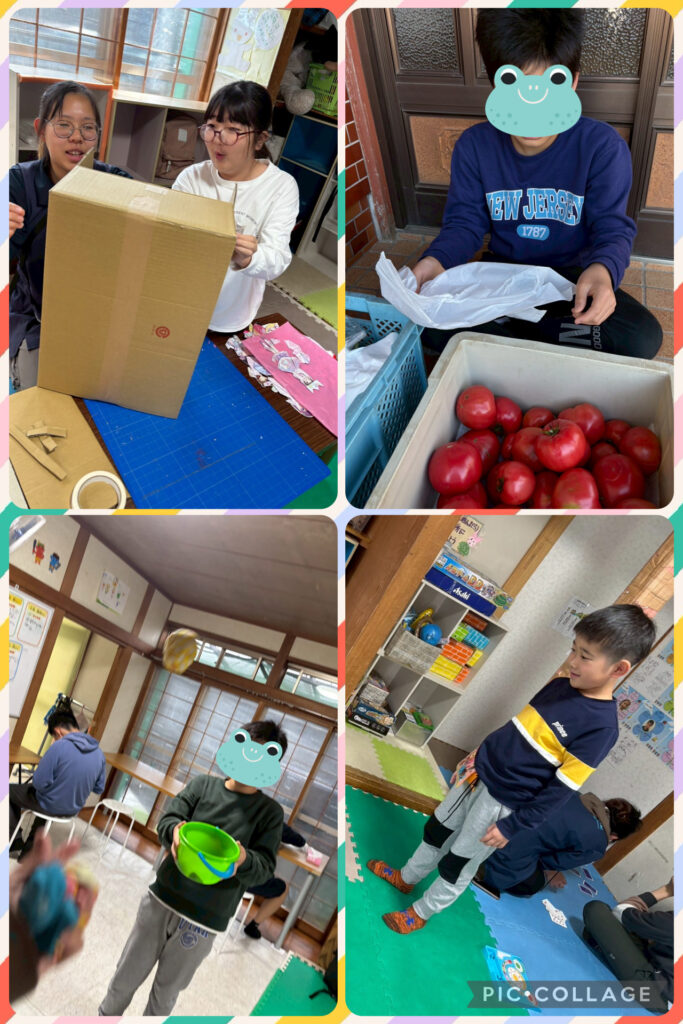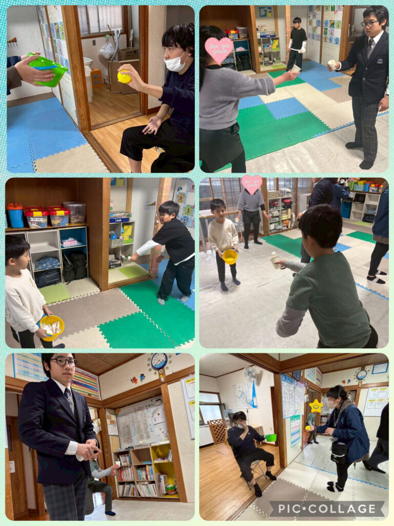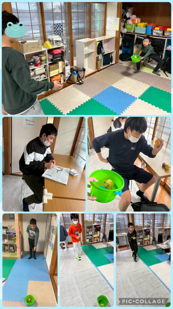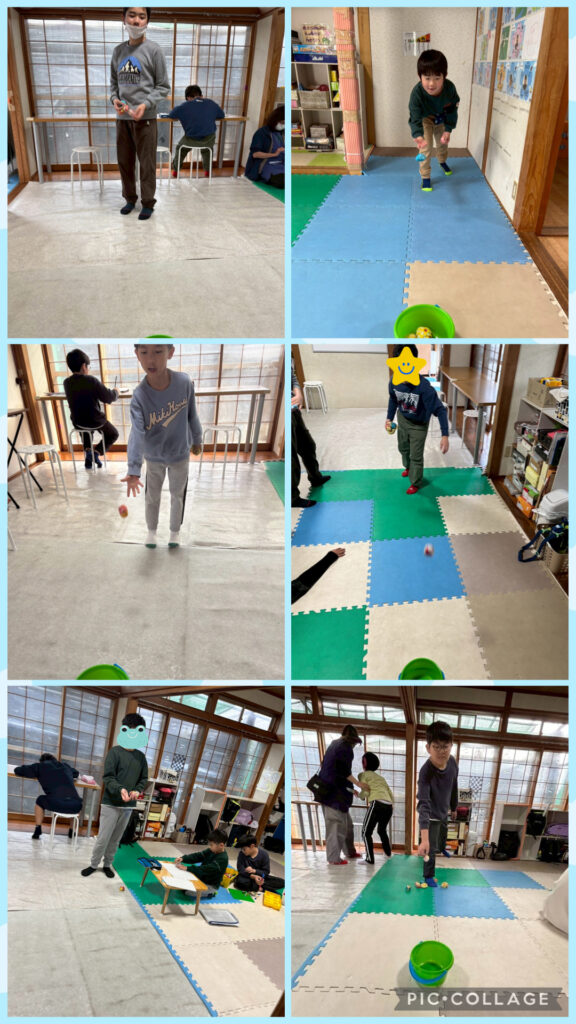 今週の練習の様子です。今週の運動はおじゃみの投げ入れです。山なりになるように調整して投げることを声掛けしています。