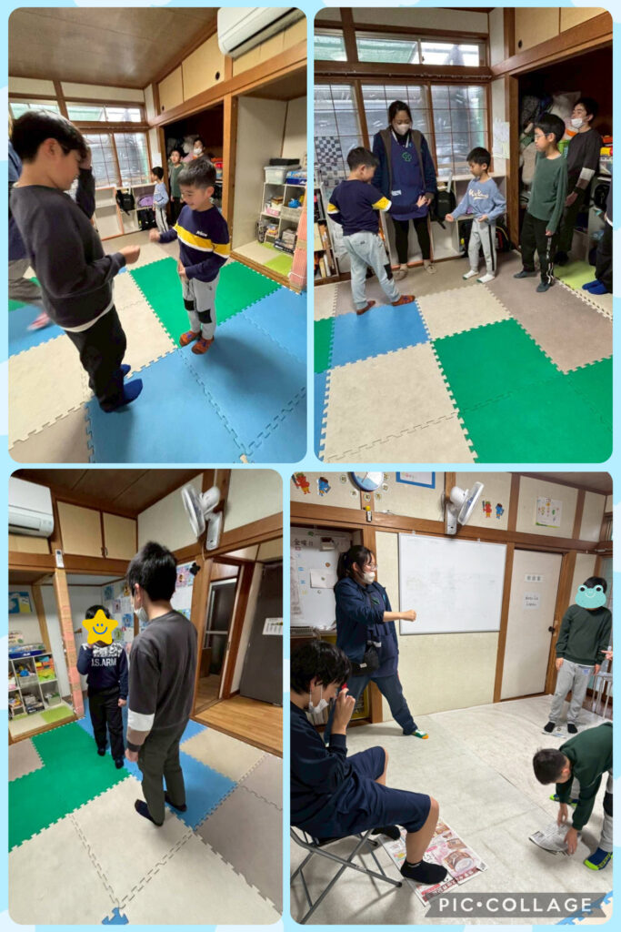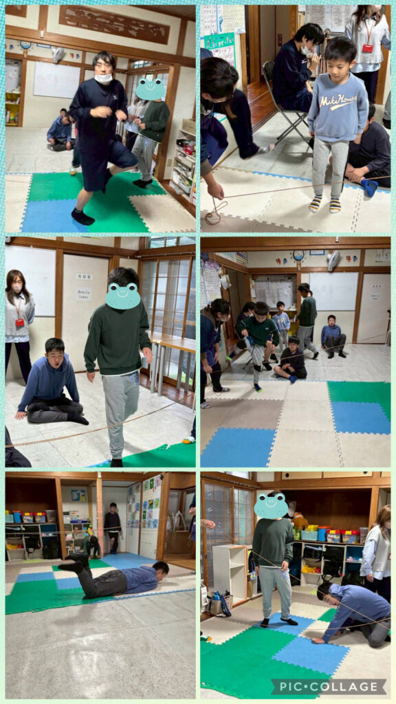 今週の集団活動の様子です。新聞じゃんけんやへびじゃんけん、ひもくぐりなどさまざまな活動を行っています。