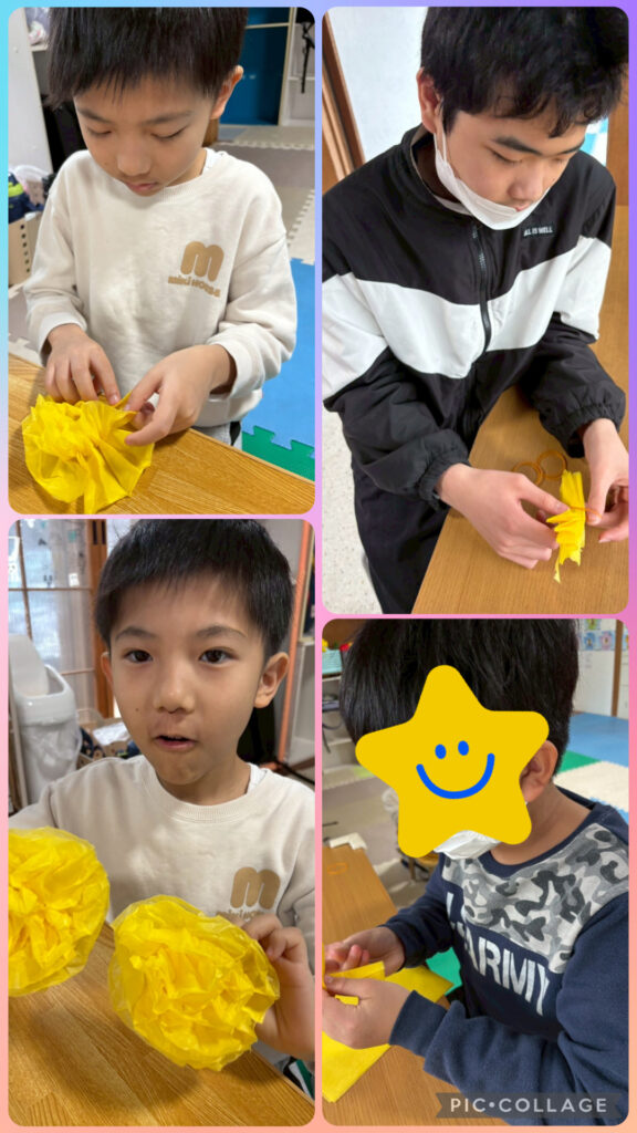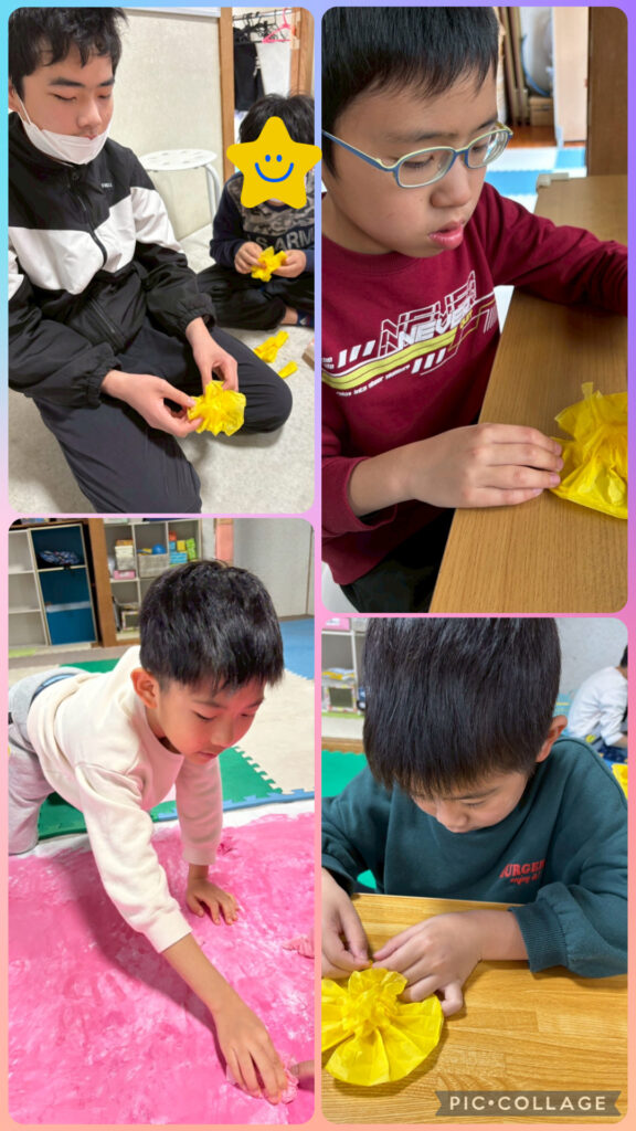 また春の壁画制作を行いました。花紙でたんぽぽや桜を作ってもらったり手に直接絵の具をつけて大きな桜の木を作ってもらいました。