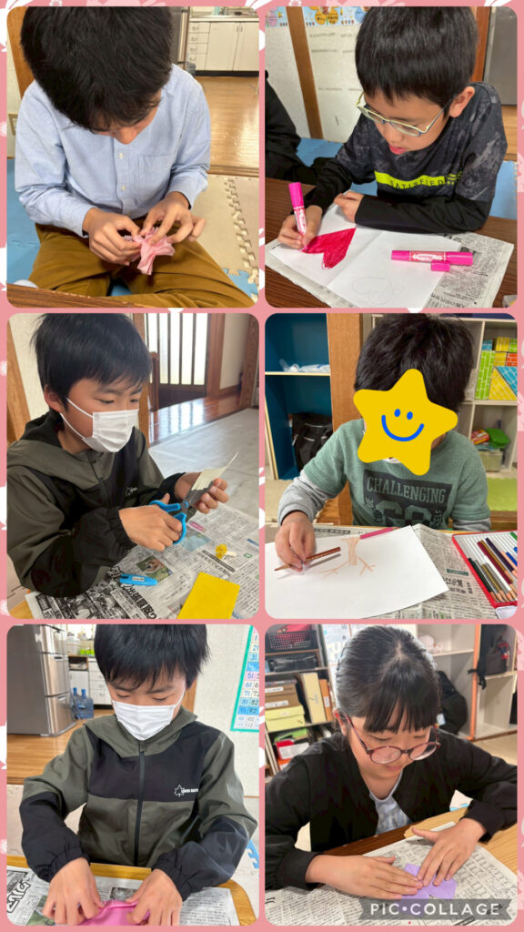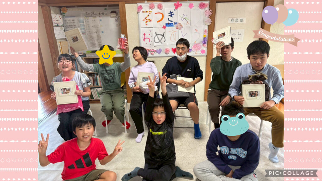 そして28日土曜日に卒業生のお祝い会をしました。午前中にはみんなで飾り付けをしました。そしてみんなでお弁当を食べ午後は1人ずつ抱負やメッセージを話したりおやつパーティーをしました。