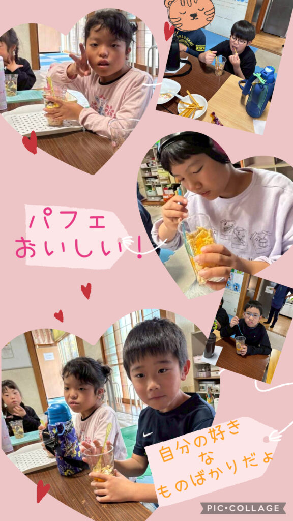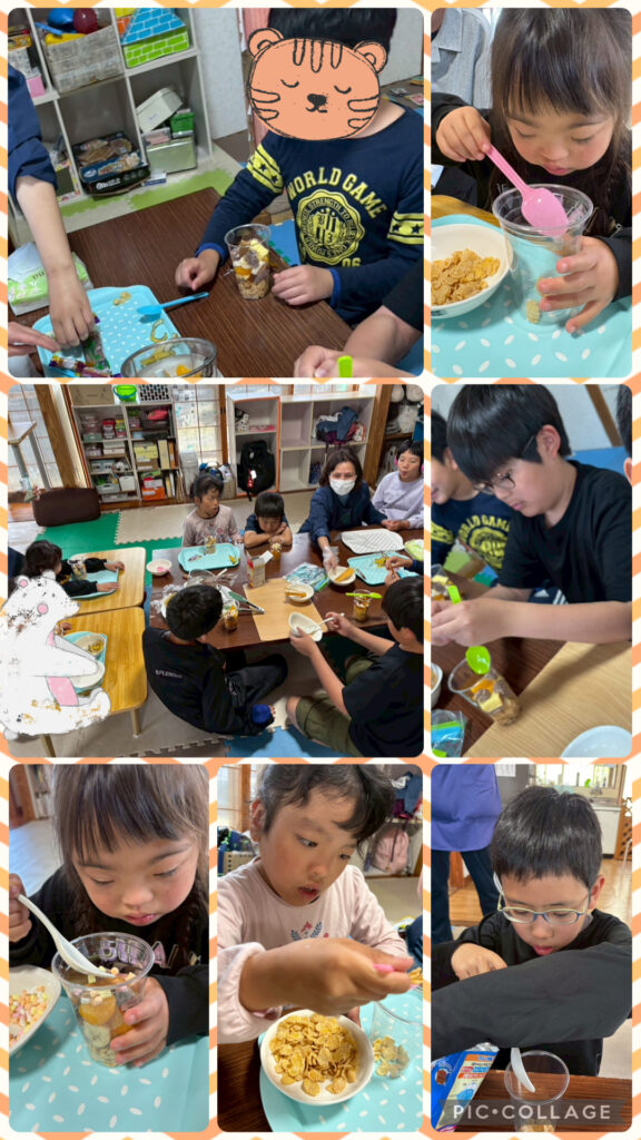 みんなでパフェ作りをしました!!チョコホイップ・フルーツ・フレーク・お菓子トッピングを自分の好きなものだけ入れて作りました♡