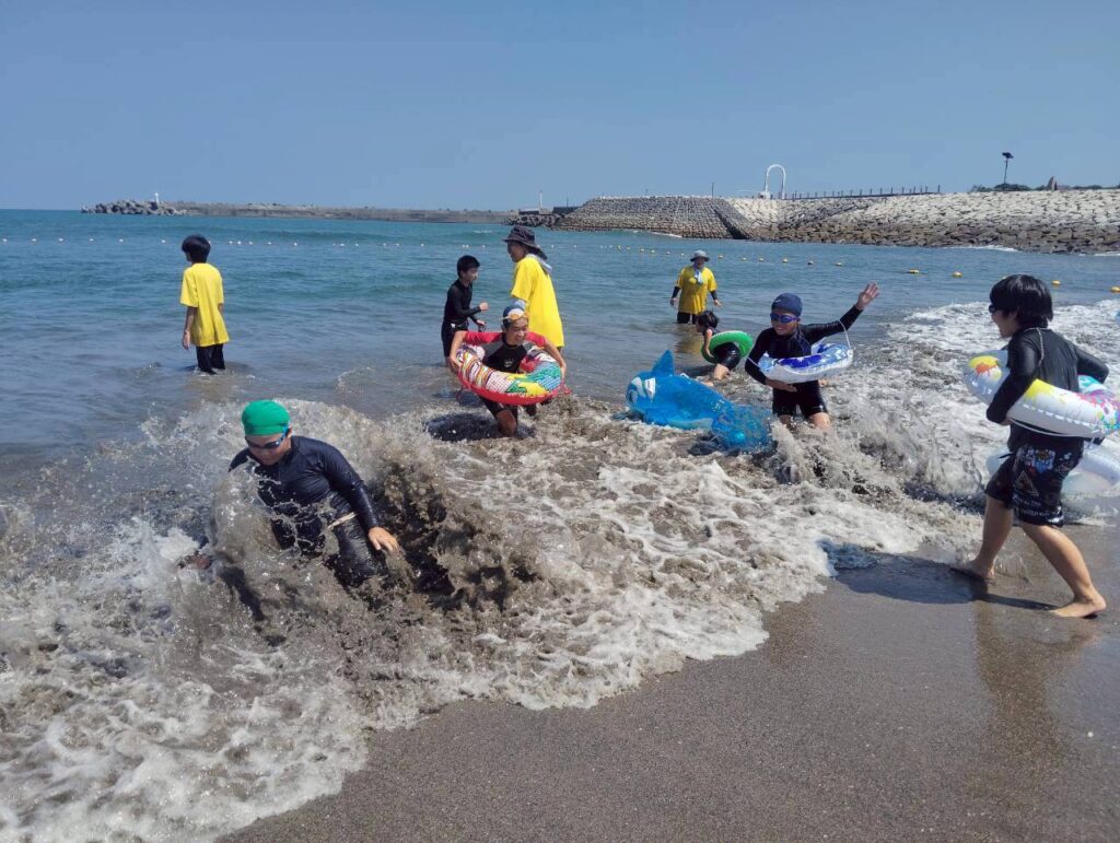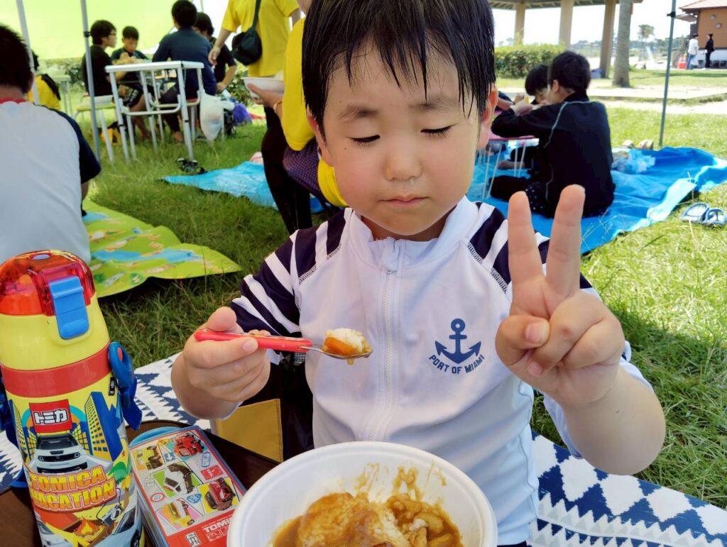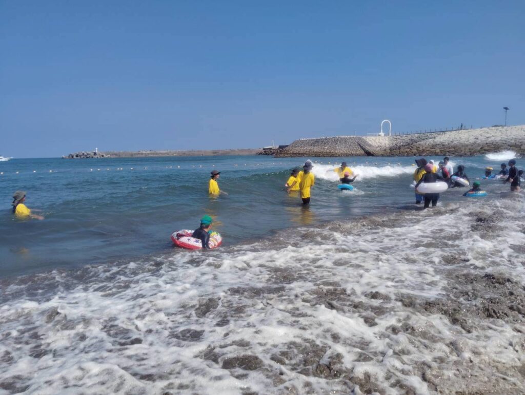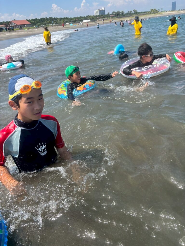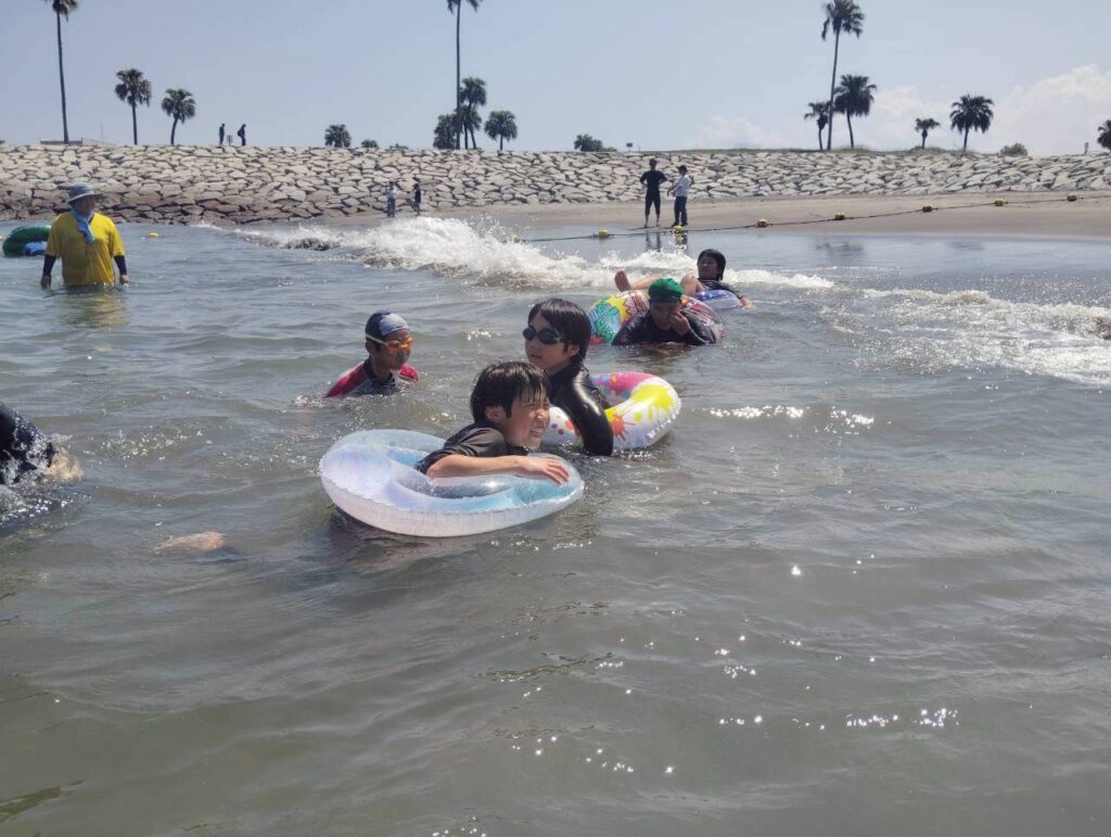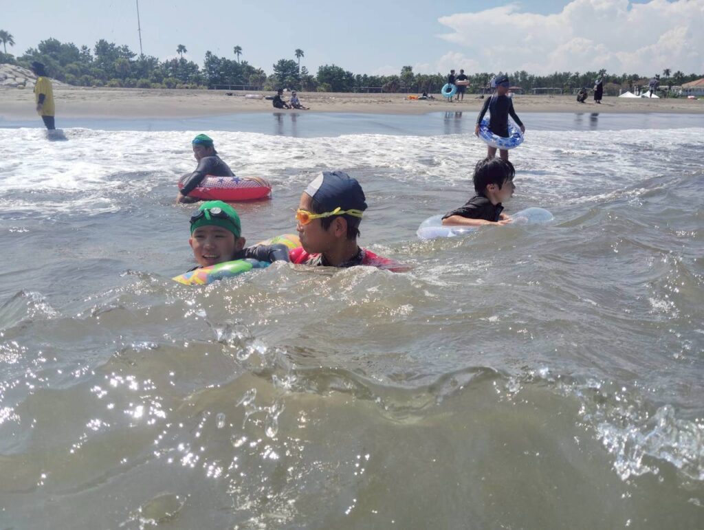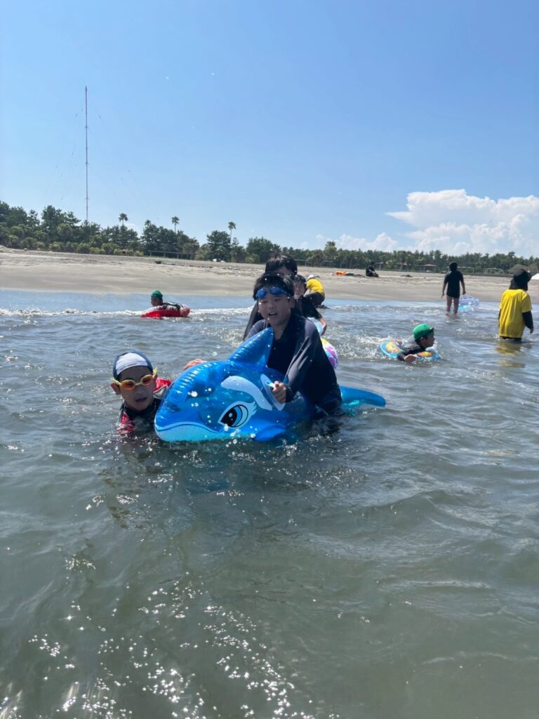 お休みが多くて児童は少なめでしたが、サンビーチ一ツ葉のバーベキューサイトでカレーライス作りをしてお腹いっぱい食べ、十分に休憩を取った後は、海水浴を楽しみました。先日の青島と違って波も強く、子どもたちは何度も波と戯れていました。しかし、児童を守る職員は荒い波に足腰を踏ん張って耐えました。