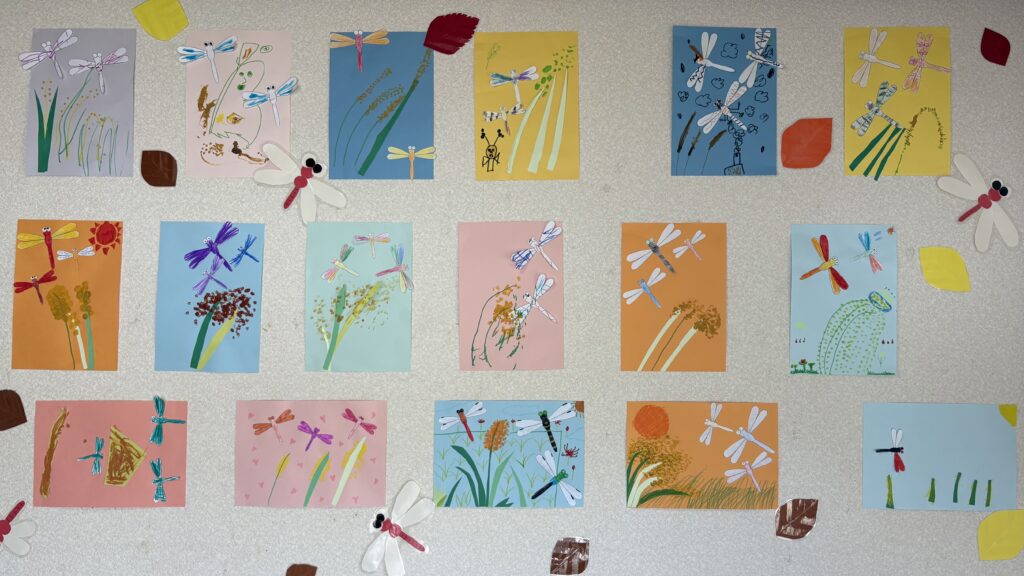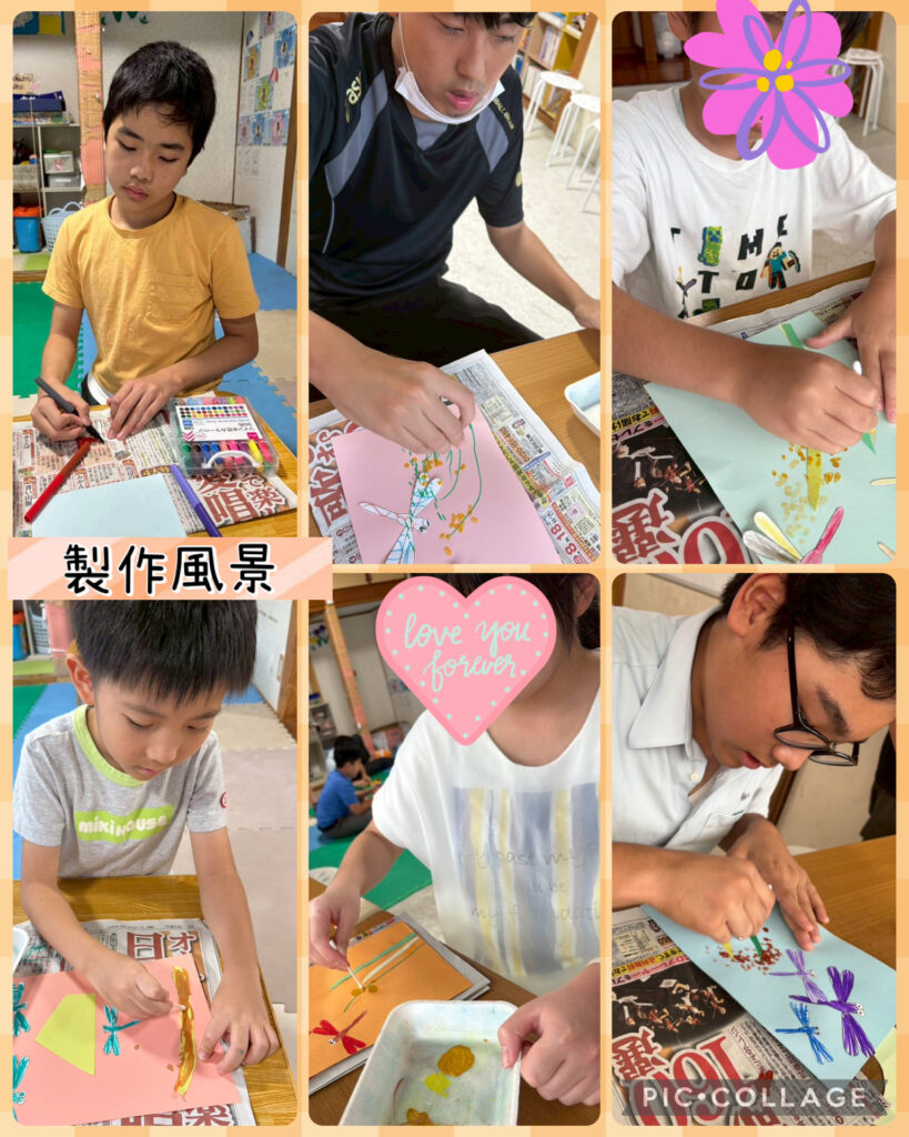 秋の製作では、今年はバケツで稲を育てており日頃から成長を見届けている児童たちに稲とトンボを作ってもらいました🌾