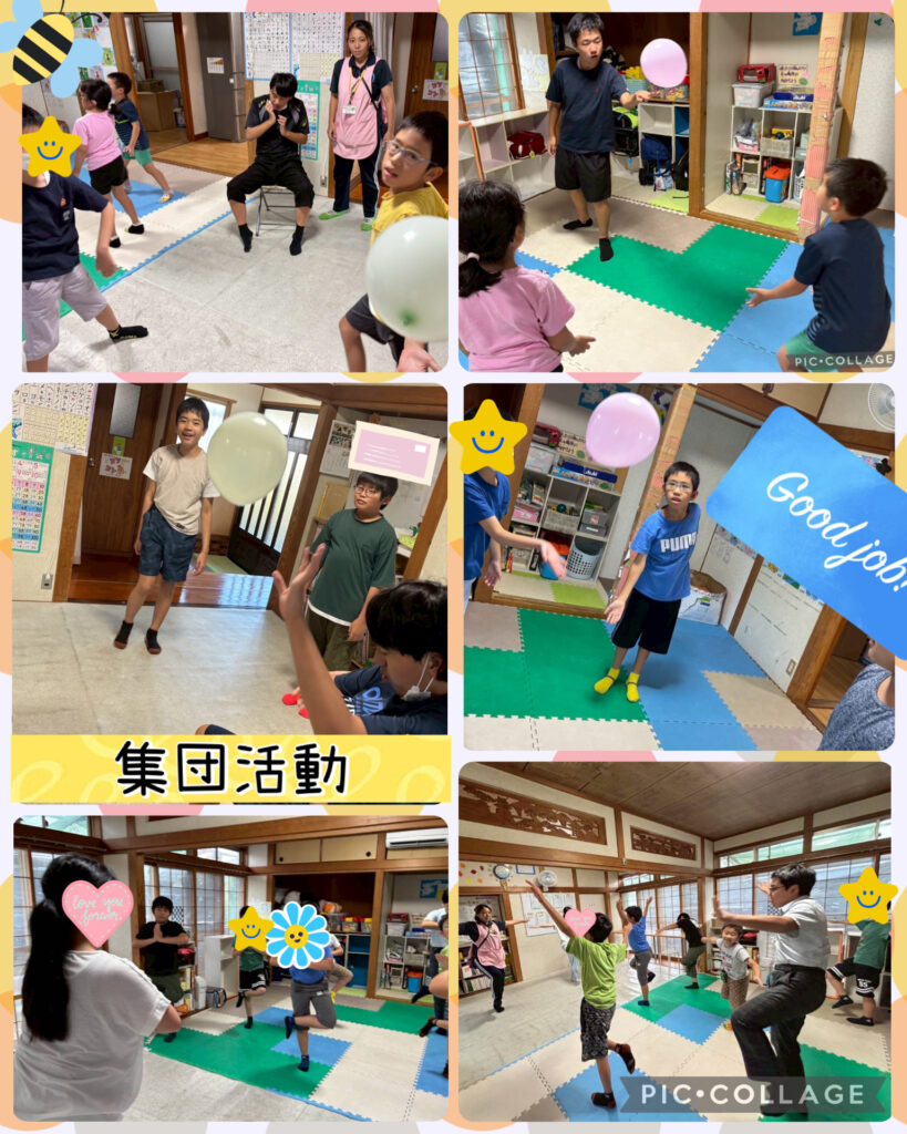 集団活動では、風船バレーや体幹運動を行い児童の協調性やリーダーシップを高めました!