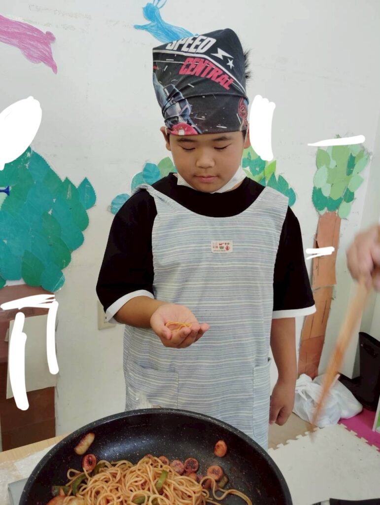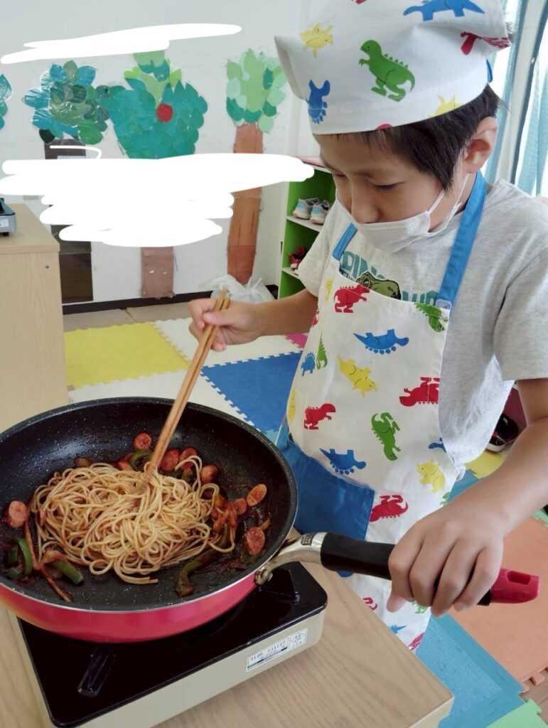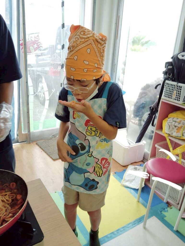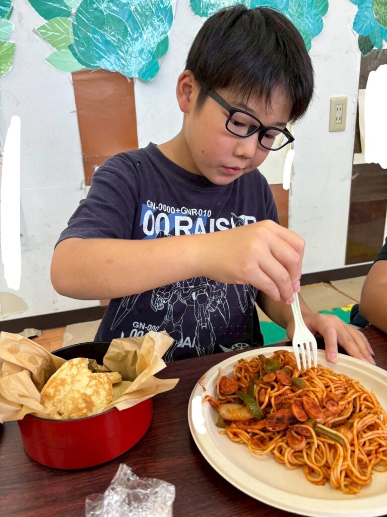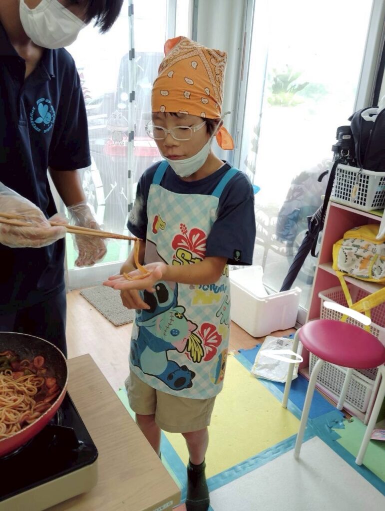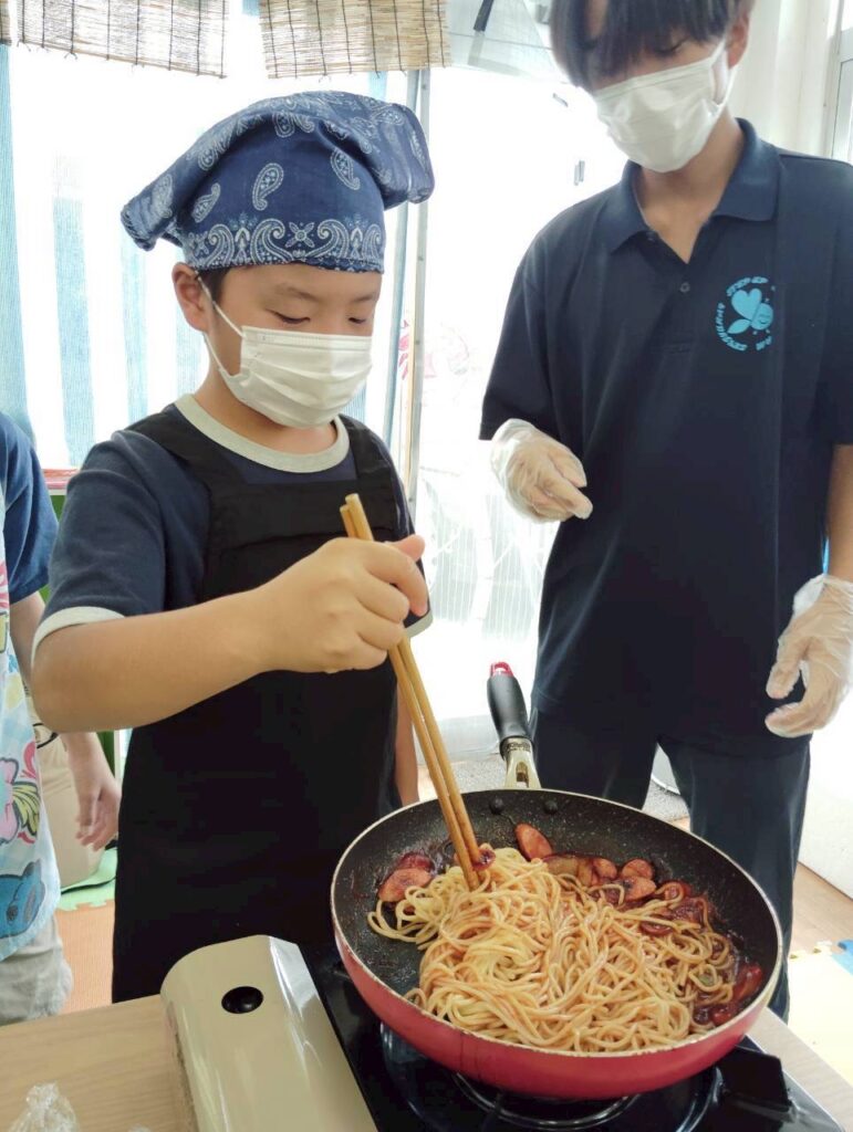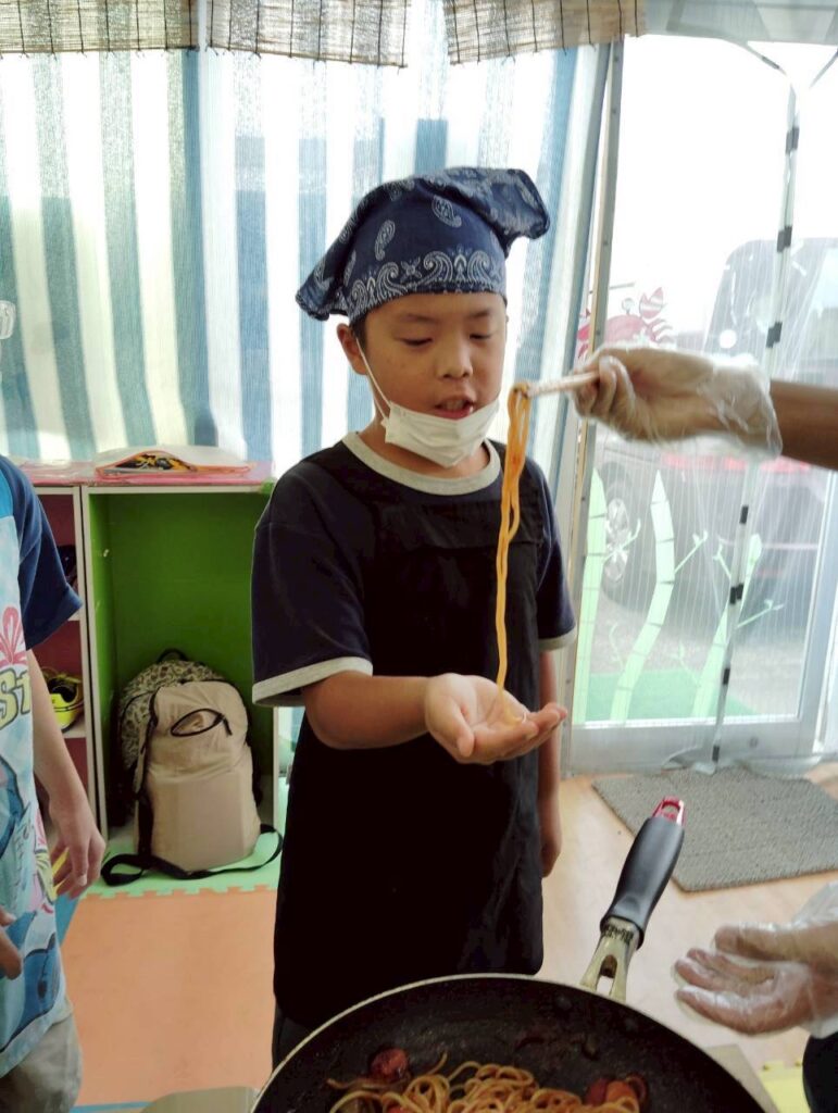 午前中はつきみがおか事業所に3事業所の児童が集まりナポリタンを作りました。