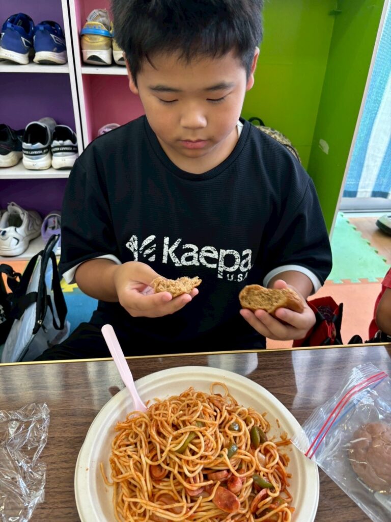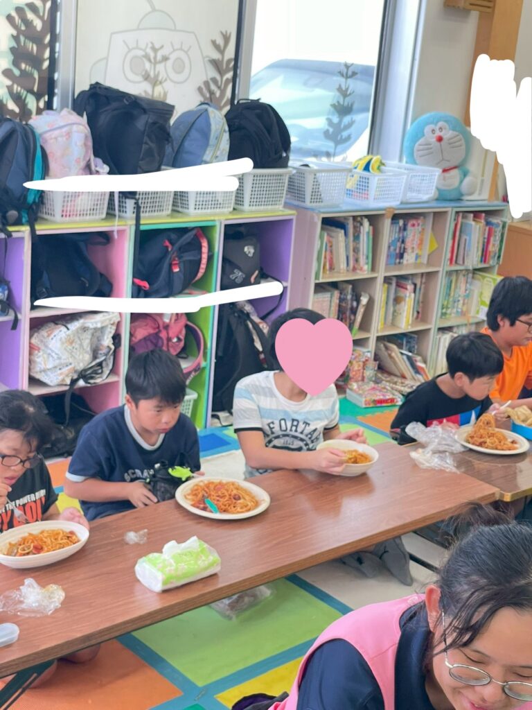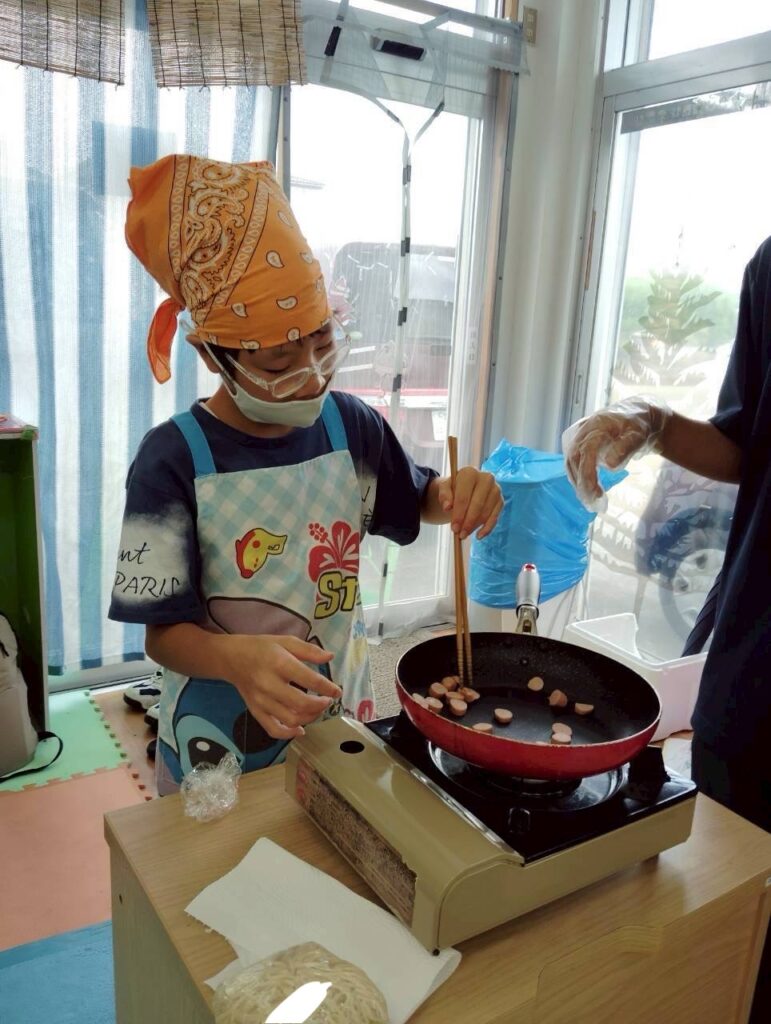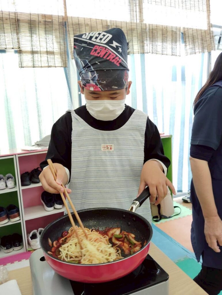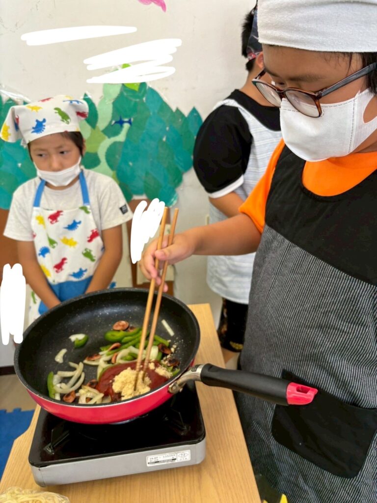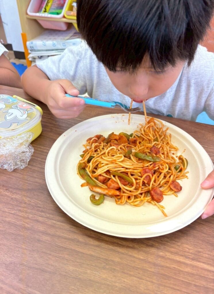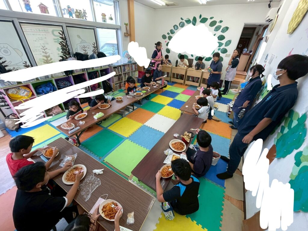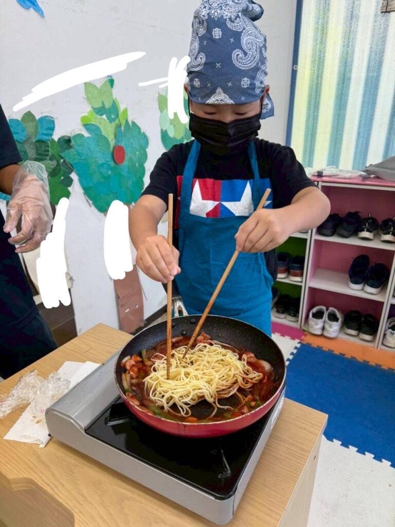 午前中はつきみがおか事業所に3事業所の児童が集まりナポリタンを作りました。
