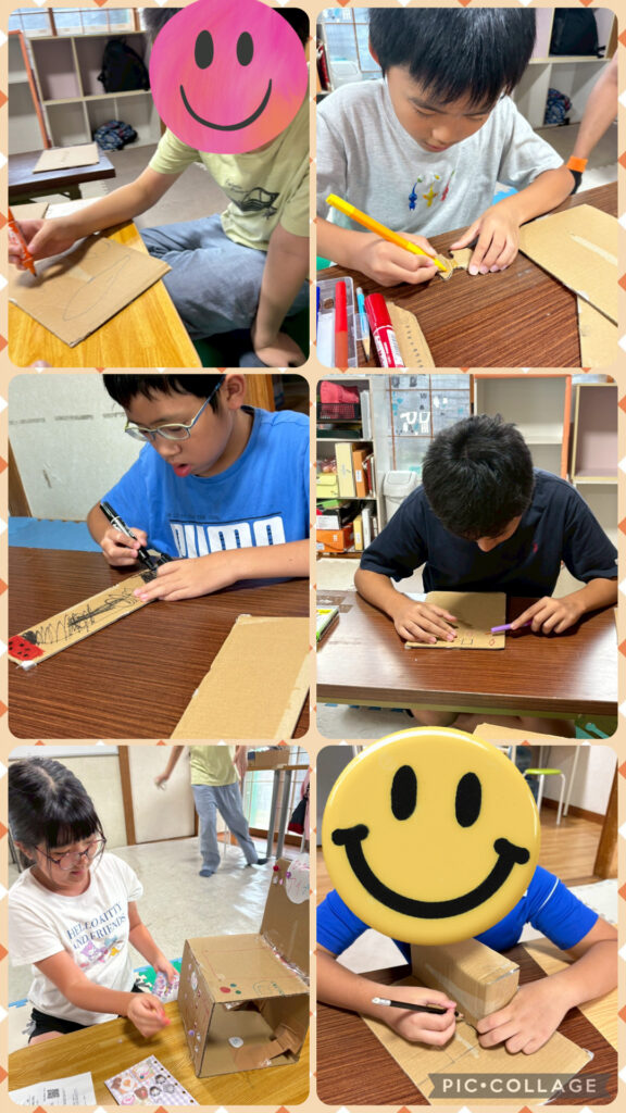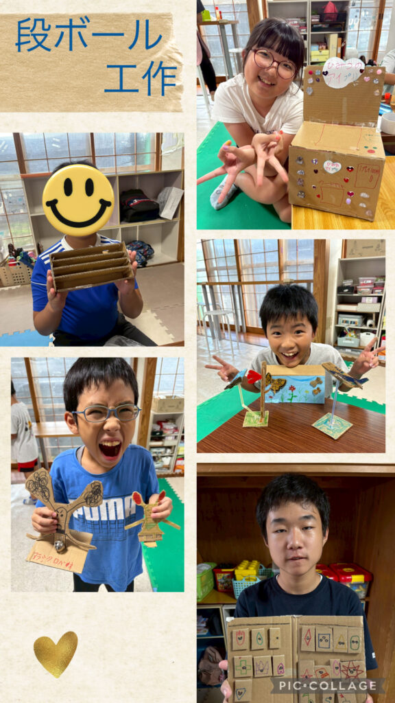 段ボールを使っての工作です。作品は児童のおまかせです!!児童の発想力が発揮してる良い作品ばかりでした⭐︎