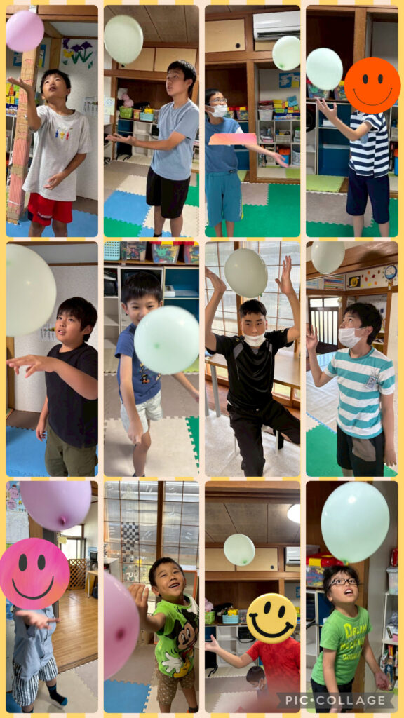 風船を使って決められた範囲内でトスする感覚運動を行いました。風船をトスする力加減の調整が難しい児童もいました。